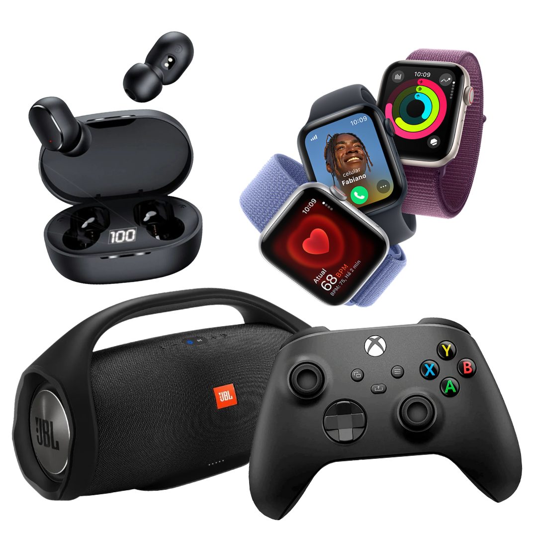Temos acessórios para celular (capas, películas, cabos, carregadores, baterias portáteis), eletrônicos em geral (fones, smartwatchs, caixas de som, acessórios para games) e também acessórios de informática.